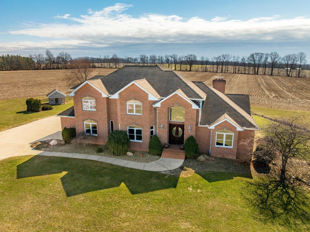Beyond a long private drive and surrounded by over 20 acres of countryside, this all-brick estate offers exceptional privacy and space. The home features over 4,600 sq ft on the first and second floors plus a finished lower level designed as full living quarters. A grand foyer with sweeping staircase welcomes you inside, with maple hardwood flooring throughout much of the main living space. The first floor includes an office or den, dining room, full bath, half bath, and laundry room. The kitchen features cherry cabinetry, granite countertops, a center island, and dinette overlooking the backyard. Upstairs includes a spacious primary suite with fireplace, walk-in closets, and spa-style bath with steam shower and soaking tub. A junior suite offers a private bath and walk-in closet, while two additional bedrooms share a Jack-and-Jill bath. The lower level includes a kitchen area, bedroom, bath, office, and rec room. The property includes open fields, mature trees, a pond, and barn.
