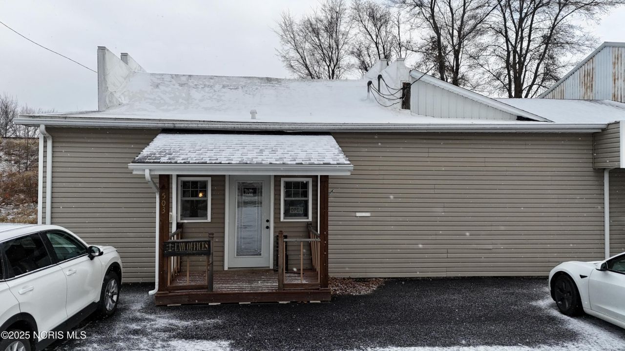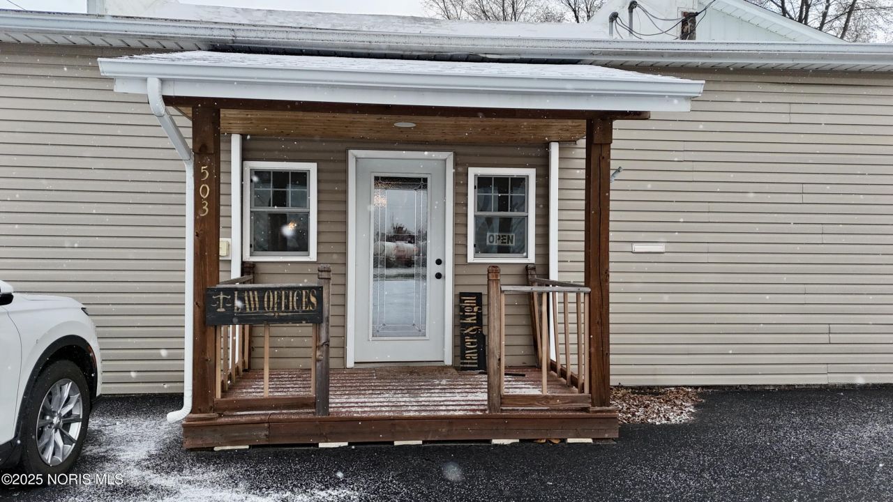 Welcome to 503 Factory Street, Hicksville, OH 43526. This recently remodeled commercial office building is move-in ready for its next owner. Formerly home to the Law Office of Haver & Kight, Shocks Hardware and Lumber, and Haver's Lumber, this property offers 10,100 sq ft of flexible and functional space and sits on just over half an acre with a spacious gravel parking lot-perfect for employees, clients, or commercial vehicles. Step inside through the attractive front entrance, complete with a covered front porch. The welcoming reception area features a beautiful front desk with a granite countertop, ideal for a receptionist or client check-in. The finished office section includes 3-4 private offices, a recently updated bathroom, a kitchen area, and durable plank wood and vinyl flooring throughout. Custom cedar trim adds a warm, one-of-a-kind feel to the entire space. An attached storefront leads directly into the massive warehouse, offering unmatched versatility. Whether you need storage, production space, workshop area, or a custom business layout, this building can accommodate whatever you can dream of. The warehouse includes a gas heater for year-round use, and the office section is well insulated for comfort and efficiency. Also included on the property is a 24x40 fenced-in canopy, perfect for covered parking, outdoor storage, or equipment protection. This versatile and well-maintained commercial property is ready for its new owner. Call today to schedule your showing!
