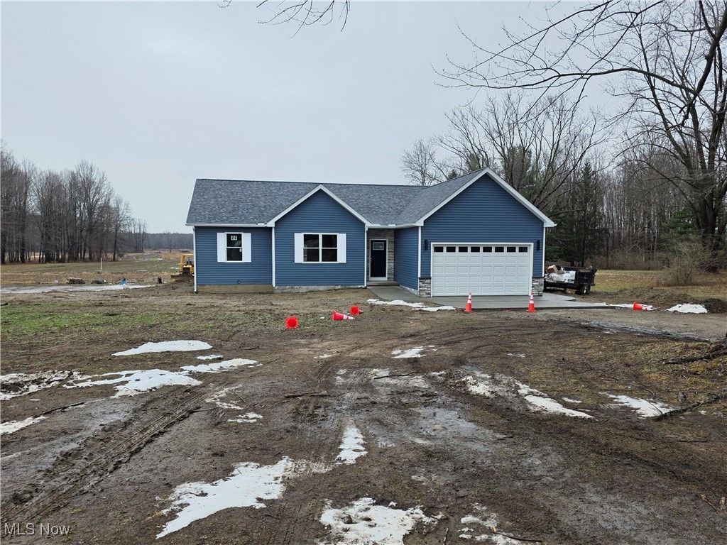 Welcome to the rare opportunity of owning a brand-new home tailored for comfort, style, and efficiency- all set on 2.37 scenic acres. This thoughtfully designed ranch blends modern construction with timeless ease of one-floor living. Imagine arriving home to your private retreat, tucked 200 feet off the road for peace and quiet, yet close to Lake Erie, charming wineries, and abundant wildlife. Step inside and be captivated by soaring 14-foot vaulted ceilings, an open-concept living, dining, and kitchen area, and elegant French doors that open to a covered back deck. This inviting outdoor space is finished with a custom-designed floor-perfect for morning coffee, summer entertaining, or relaxing while you take in the peaceful surroundings. The heart of the home features custom cabinetry and quartz counters, while luxury vinyl plank flooring flows seamlessly throughout. Your master suite is a sanctuary, with a walk-in closet and spa-inspired bath complete with a tiled walk-in shower, rain head, and body jets. Designed with energy efficiency in mind, this home offers superior insulation, an on-demand hot water tank, a gas furnace with central air, and an insulated garage door to keep you comfortable year-round. The attached two-car garage with epoxy finish adds both function and style, while the 6-course concrete crawl space offers generous storage. From the custom finishes to the thoughtful layout, every detail has been considered to create a home that feels both beautiful and practical. This is more than a home-it's a lifestyle. New construction. Energy efficiency. Privacy. Convenience. The perfect backdrop to live, relax, and enjoy.